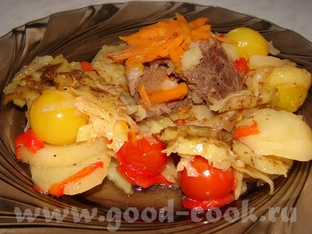 ![]() Мясо - говядина, морковка, лук, чеснок, помидорки черри, картошка |